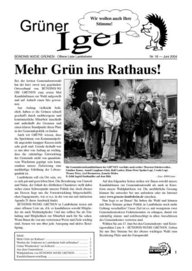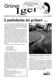 Im Juni 2004 stehen die Gemeinderatswahlen an, für die zum zweiten Mal die GRÜNEN mit einer Kandidatenliste kandidieren werden. Ausgabe Nr. 15 des Grünen Igel enthält einen Rückblick über die vergangenen 5 Jahre GRÜNER Arbeit im Lambsheimer Gemeinderat. Daneben setzt sich die Ausgabe kritisch mit den Hoffnungen auf eine "Ortsumgehung Ost" einer "großen Koalition" von CDU, SPD, FWG und FDP im Lambsheimer Gemeinderat auseinander. Sind "mehr Straßen" wirklich die Lösung? Ebenfalls kritisch im grünen Fokus: Die ein weiteres Mal erhöhten Strompreise bei den örtlichen Gemeindewerken und der sich abzeichnende Bau eines weiteren Einkaufsmarktes im Ort.