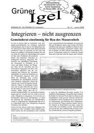 Die Ausgabe Nr. 21 des Grünen Igel steckt ein weiteres Mal eine breite Palette aktueller lokaler Themen ab. Die Querelen und Anwohnerbefürchtungen im Zusammenhang mit dem beabsichtigten Neubauvorhaben des Masurenhofes sind ebenso ein Thema wie die zweifelhafte Öffenlichkeitsarbeit von Bürgermeister und CDU in Verbindung mit dem „Haus der Vereine”.
