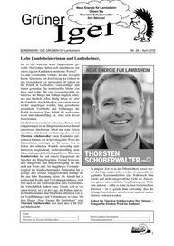 Die vorliegende aktuelle Ausgabe Nr. 26 des Grünen Igel steht ganz im Zeichen der Lambsheimer Bürgermeisterwahl am 16. Mai 2010. Erstmals stellen die Lambsheimer GRÜNEN mit Thorsten Schoberwalter einen Kandidaten aus den eigenen Reihen.